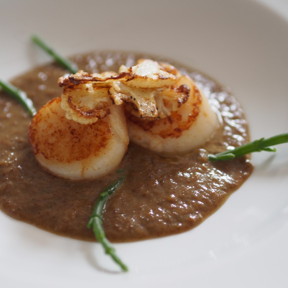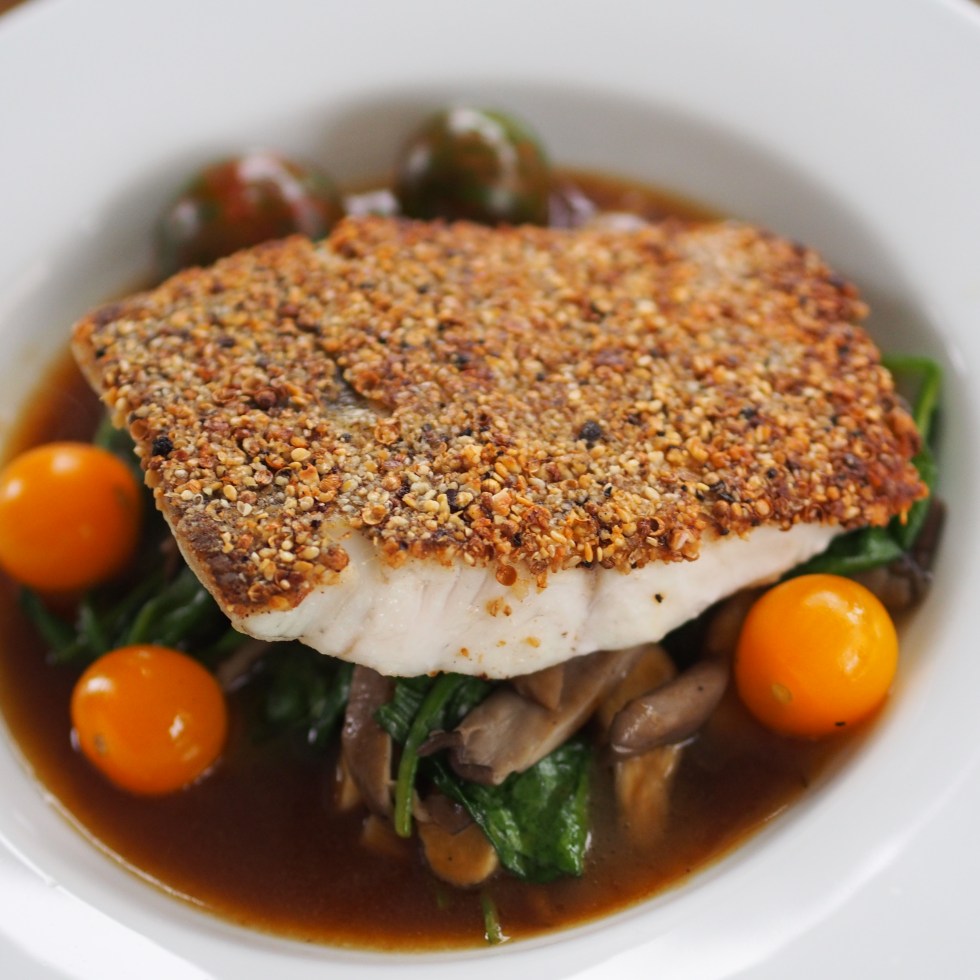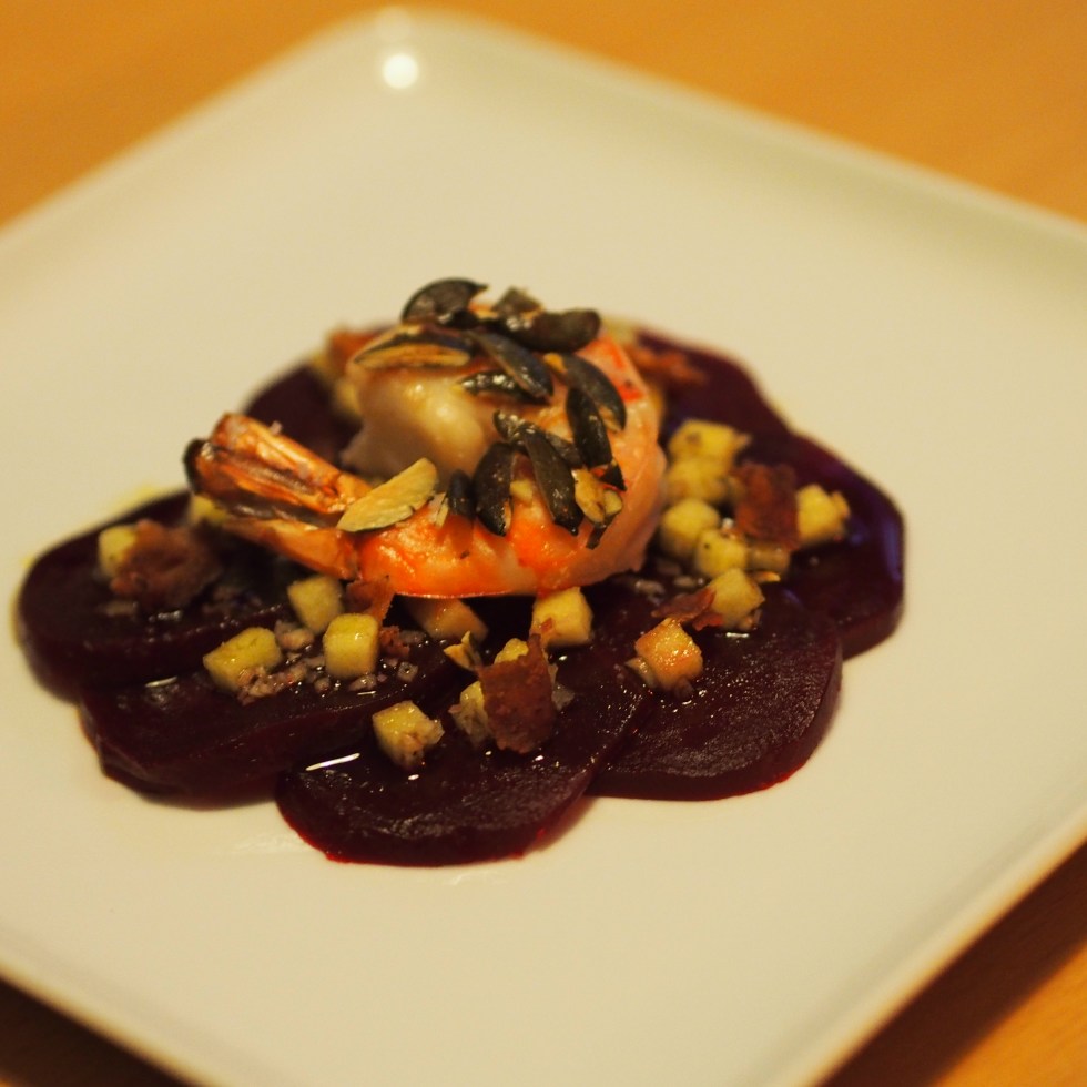 Riesengarnele mit Kürbiskernen auf Rote-Bete-Carpaccio