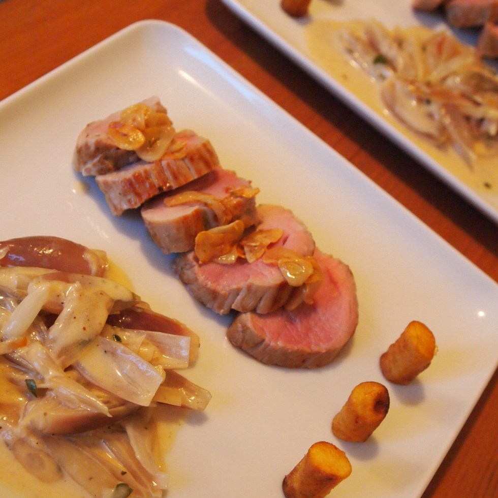 Schweinefilet mit Knoblauch, Schalottengemüse und Kartoffelhülsen