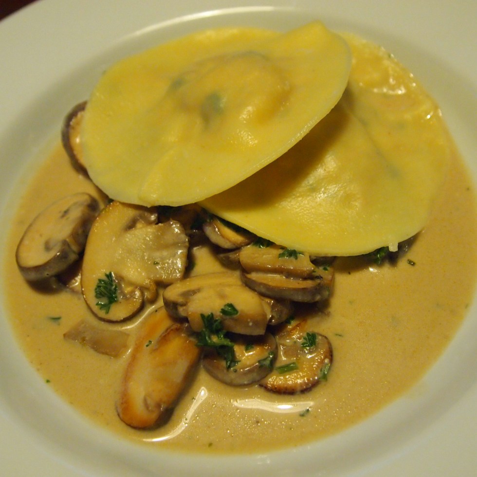 Kartoffel-Ziegenfrischkäse-Maultaschen mit Rahmpilzen