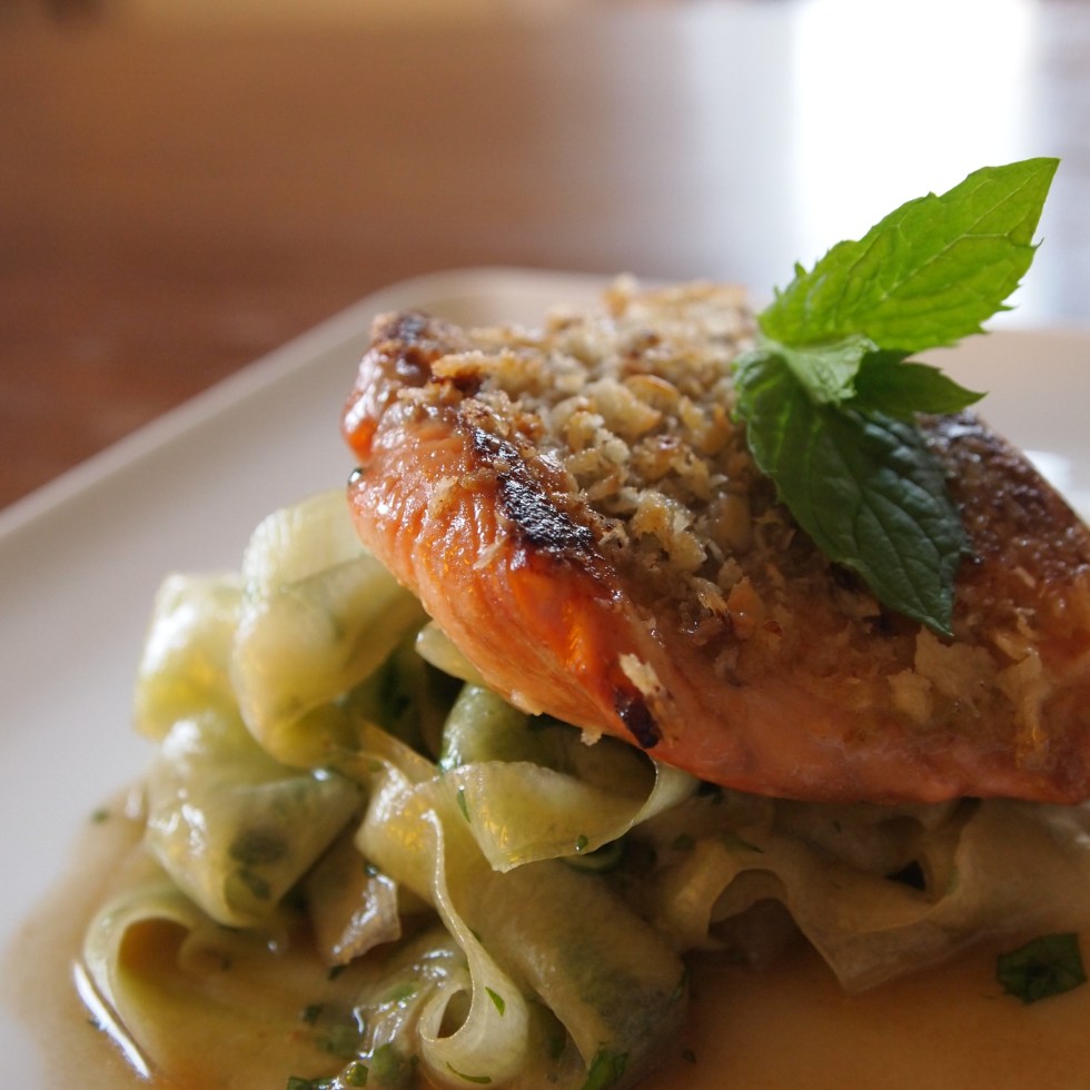 Lachs mit Wasabi-Panko-Kruste auf Koriander-Gurkensalat