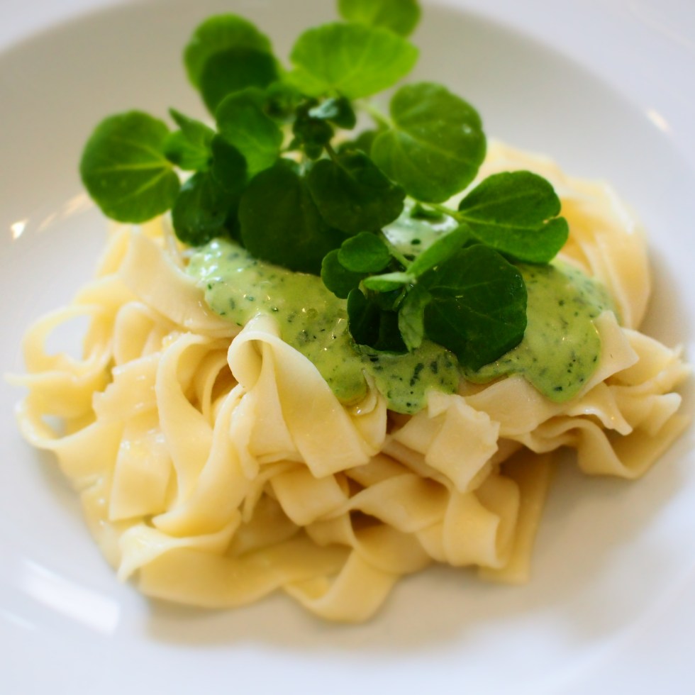 Tagliatelle mit Radieschenblatt-Ziegenkäse-Pesto